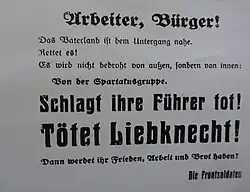 Nach den führenden Köpfen der jungen KPD wurde durch „zahlreiche Spitzeldienste diverser ‚staatstragender Verbände‘“[41] intensiv gefahndet. Schon im Dezember waren in Berlin zahlreiche großformatige rote, gegen den Spartakusbund gerichtete Plakate angeschlagen worden, die in der Aufforderung „Schlagt ihre Führer tot! Tötet Liebknecht!“ gipfelten.[42] Handzettel gleichen Inhalts wurden hunderttausendfach verbreitet.[43] Verantwortlich dafür war unter anderem die Antibolschewistische Liga Eduard Stadtlers. Im Vorwärts wurde Liebknecht wiederholt als „geisteskrank“ dargestellt.[44] Der gesamte Rat der Volksbeauftragten unterzeichnete am 8. Januar ein Flugblatt, in dem angekündigt wurde, dass „die Stunde der Abrechnung naht“.[45] Tags darauf erschien dieser Text als amtliche Nachricht im Deutschen Reichsanzeiger. Unter Zivilisten und Militärangehörigen kursierten – verbreitet unter anderem von Scheidemanns Schwiegersohn Fritz Henck – Gerüchte, die besagten, dass auf die „Spartakistenführer“ regelrechte Kopfgelder ausgesetzt worden seien.[46] Am 14. Januar war in einem Mitteilungsblatt für die sozialdemokratischen Regimenter Reichstag und Liebe zu lesen, dass „schon die nächsten Tage“ zeigen würden, dass nunmehr auch mit den „Häuptern der Bewegung […] Ernst gemacht wird.“[47]