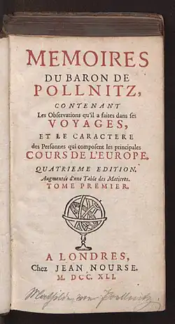 - Nouveaux mémoires du Baron Pöllnitz contenant l’histoire de sa vie et la relations de ses premiers voyages, 2 Bde., Amsterdam 1737 und Frankfurt 1738.