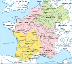 - ↑ Andreas Fischer: Karl Martell. Der Beginn karolingischer Herrschaft. Stuttgart 2012, S. 188. Martina Hartmann: Die Merowinger. München 2012, S. 54.