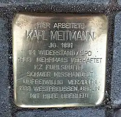 - ↑ Einladung zur Jahrestagung des Arbeitskreises ehemals verfolgter und inhaftierter Sozialdemokraten und zur Stolperstein-Einweihung für den früheren SPD-Landesvorsitzenden Karl Meitmann, Berlin im Januar 2022