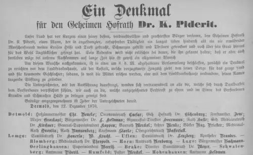 Drei Jahre nach seinem Tod wurde Karl Piderit mit einem Denkmal vor dem Detmolder Landeskrankenhaus geehrt.