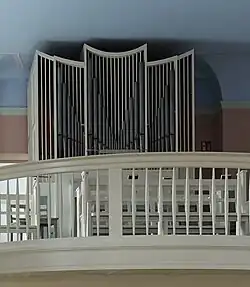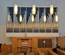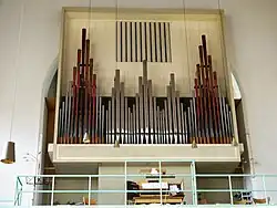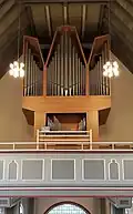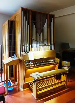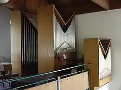 I/P 6 Das Instrument stand vorher im Gemeindehaus und wurde 1958 als Chororgel in der Kirche aufgestellt; geteilte Schleifen. → Orgel