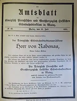 - ↑ Eisenbahndirektion Mainz (Hg.): Sammlung der herausgegebenen Amtsblätter 7 (1903). Mainz 1904. Amtsblatt vom 20. April 1903. Nr. 22, S. 205.