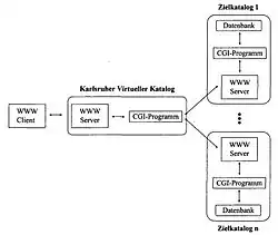 Erst kurz vor der Entwicklung des KVK hatte man in Deutschland die elektronischen Bibliothekskataloge mit WWW-Schnittstellen ausgerüstet. Diese OPACs waren nun über das WWW zugänglich: Benutzer gaben ihre Suchbegriffe in HTML-Formulare auf den Webseiten der Bibliotheken und Verbünde ein und erhielten eine Trefferliste im HTML-Format. Zwischen der Eingabe und der Trefferliste formulierte ein CGI-Programm aus den Eingaben eine Datenbankabfrage und bereitete die Trefferliste benutzerfreundlich auf. Um alle diese Kataloge gleichzeitig durchsuchen zu können, erstellte das KVK-Team ein CGI-Programm, das zunächst die im KVK-Suchformular eingegebenen Begriffe für jeden der Zielkataloge entsprechend dessen Anforderungen umformuliert. Anschließend schickt das Programm die Anfrage parallel an alle gewünschten Zielkataloge, sammelt und analysiert dann die einzelnen Trefferlisten und erstellt schließlich eine Gesamttrefferliste in einem einheitlichen Format. Sobald eine der einzelnen Trefferlisten dem Programm vollständig vorliegt, wird diese formatiert und in der sich kontinuierlich aufbauenden Gesamttrefferliste angezeigt. Das CGI-Programm kommuniziert dabei direkt mit den WWW-Servern der einzelnen Zielkataloge. Der KVK wurde mit der Skriptsprache Tcl realisiert.