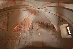 An der Westwand sind eine Madonna, die Heiligen Agnes und Margareta, die Darbringung im Tempel, Zug und Anbetung der Heiligen drei Könige, die Geburt Christi und die Anbetung der Hirten wiedergegeben. Die Ostwand zeigt Johannes den Täufer, den heiligen Stephanus, Maria in der Hoffnung und ein Fragment eines männlichen Stifters. Die nordöstliche Stichkappe ist mit einer Kreuzigungsgruppe und der heiligen Barbara bemalt. Die untere Zone besteht aus Apostelkreuzen über einem gemalten Vorhang.