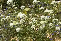 Im zweiten Jahr entwickelt sich der reich verzweigte Stängel, der die Blütenstände trägt und Wuchshöhen von bis zu 150 cm erreicht. Die Blütezeit beginnt im Juni. Im doppeldoldigen Blütenstand befinden sich viele Blüten. Die Blüten sind meist zwittrig und können auch steril oder teilsteril sein. Sie sind cremefarben. Es überwiegt Fremdbestäubung, die durch Insekten erfolgt. Die Bildung der Blütenstände kann auch bereits im ersten Jahr durch einen Kältereiz (Vernalisation) von 1 bis 10 °C nach der Jugendphase ausgelöst werden.