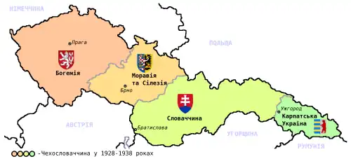 Die ukrainische Bevölkerung Transkarpatiens trat der Ersten Tschechoslowakischen Republik aufgrund eines Abkommens zwischen Tomáš Garrigue Masaryk, Vertretern transkarpatischer Einwanderer in den Vereinigten Staaten, sowie einer Entscheidung des Zentralruthenischen Volksrates in Uschhorod vom 9. Mai 1919 bei. Dieser Schritt erhielt internationale Zustimmung im Vertrag von Saint-Germain vom 10. September 1919, der Transkarpatien den Status einer autonomen Region innerhalb der Tschechoslowakischen Republik garantierte, wobei die versprochene territoriale und nationale Autonomie nicht verwirklicht wurde.[2][3] Durch den Wiener Schiedsspruch vom 2. November 1938 wurde der südwestliche Teil der Karpatenukraine an das Königreich Ungarn überführt.[3][4]