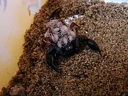 Die Weibchen des Karpatenskorpions tragen ihre frisch geschlüpften Jungen für eine Weile auf ihrem Rücken herum. Die aktuell anerkannte Art aus Rumänien überwintert in Spalten im Lehmboden von Flussufern mit Buschbestand.[1]