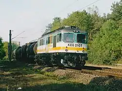 Für den Reiseverkehr übernahm die KEG ab 1993 zahlreiche gebrauchte MAN-Schienenbusse, die im Karsdorfer Betriebswerk aufgearbeitet wurden.[10] Dieser Bestand wurde in den Jahren 1997 bis 1999 durch insgesamt 19 Triebwagen des Typs LVT/S ergänzt und später ersetzt. Weiterhin wurde sie durch den Ankauf einer großen Anzahl von Diesellokomotiven der CFR-Baureihe 060 DA zur Bespannung schwerer Güterzüge sowie der Mehrheitsbeteiligung am rumänischen Waggonhersteller Romvag aus Caracal in Fachkreisen bekannt. Auch eine rumänische Elektrolokomotive der CFR-Baureihe 060 EA (CFR 40-0079) wurde gekauft, auf das deutsche Bahnstromsystem umgebaut und auf der InnoTrans 2000 ausgestellt.[11] Ab 2002 trug sie die KEG-Nummer 7001, erhielt jedoch wegen des Insolvenzverfahrens keine deutsche Zulassung und kehrte nach langer Abstellzeit in Karsdorf und einem Aufenthalt in Schweden[12] (2011 bis 2016) nach Rumänien zurück.[13]