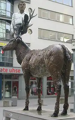 Nachdem auch das Haupthaus 1995 umgebaut worden war und der „Schick“ der 1950er-Jahre-Fassade einer moderneren,[1] größtenteils transparenten Glasfassade gewichen war,[10] stiftete das Warenhaus Karstadt 2002 die farbig bemalte Bronzeplastik „Mann mit Hirsch“ des Künstlers Stephan Balkenhol am neu gestalteten sogenannten Andreaeplatz Ecke Schillerstraße.[9]