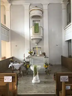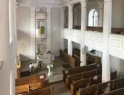 Die klassizistische Dorfkirche ist ganz in Weiß mit sparsamen vergoldeten Akzenten gehalten. An der westlichen Stirnseite des Kirchenraums befinden sich Altar und Kanzel in der Anordnung als Kanzelaltar, die Kanzel über dem Altar hat einen runden Schalldeckel, gekrönt von einem vergoldeten Pinienzapfen, und ist von der Sakristei aus begehbar. Das Altarensemble wird von zwei raumhohen Pilastern eingerahmt, ebenfalls mit ägyptisierenden Kapitellen. Im Altarraum steht erhöht mittig vor dem Altar der runde Taufstein.