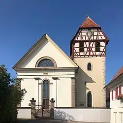 Der leicht quer-rechteckige Kirchturm der einstigen mittelalterlichen Blasiuskapelle steht an der Nordseite des Kirchengebäudes nahe der Nordostecke. Er hat einen Turmaufsatz in alemannischem Fachwerk aus dem 15. Jahrhundert, darüber ein Satteldach, das an den Giebelseiten leicht abgewalmt ist. In beiden Giebelfeldern sieht man jeweils eine große Turmuhr mit römischen Zahlen.
