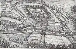 Die Klosteranlage entstand am Ort einer Burg, die durch die 1170 erstmals erwähnten Ritter von Weddern errichtet wurde.[2] Die Burg war zuerst ein Lehen der Johanniterkommende Steinfurt und ab 1294 des Bistums Münster. 1371 wurde die Burg an Bernhard von Merveldt übertragen, nach 1420 gelangte sie durch Heirat an die Herren von Keppel.