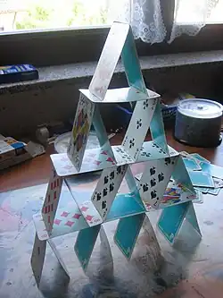 Ein Kartenhaus wird aus Spielkarten, Bierdeckeln oder Dominosteinen errichtet und ist ein recht instabiles Bauwerk.