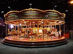 Ein Karussell (französisch carrousel), früher auch Ringelreiten, im süddeutschen Raum Reitschule, in Österreich Ringelspiel und in der Schweiz (mundartlich) Rösslispil, Rössliritti oder Riitschuel genannt, ist in der heutigen Wortbedeutung ein um eine vertikale Achse drehbares Gestell, durch das Personen auf Sitzen verschiedener Art im Kreis gedreht werden. Es ist in vielen Varianten als Fahrgeschäft auf Jahrmärkten, Weihnachtsmärkten, sonstigen Volksfesten und in Vergnügungsparks anzutreffen. Es ist zu beachten, dass der Begriff Ringreiten für einen eigenständigen Pferdesport steht, bei dem der Reiter einen kleinen Ring im Galopp mit einer Lanze oder einem Ringstecher aufspießen muss. Bis ins 19. Jahrhundert verstand man unter einem Caroussel eine öffentliche Vergnügung des Adels, bei dem man zu Pferd und manchmal auch mit Wagen im Kreis fuhr.[1]