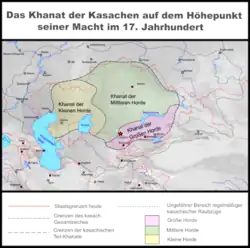 Die Kasachen werden bis heute in drei „Schüs“ (kasachisch Jüz „Abteilung“) oder „Horden“ unterteilt: in die Jüngere Horde (Kişi Jüz), die Mittlere Horde (Orta Jüz) und die Ältere Horde (Ulı Jüz).
