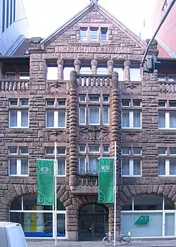• Die Grundstücke Kasernenstraße Nr. 61 bis 67a (aktuell Nr. 61 und 63) lagen nördlich neben der Großen Synagoge. Um 1905 errichtete die Ortskrankenkasse für Fabrikarbeiter und Metallarbeiter auf Grundstück Nr. 67a ein Gebäude, das zur Keimzelle des AOK-Verwaltungskomplexes in Düsseldorf wurde und das Alte AOK-Verwaltungsgebäude genannt wird.[54] Ab 1908 war erstmals neben der Ortskrankenkasse für Fabrikarbeiter und Metallarbeiter auch die Gemeinsame Ortskrankenkasse und der Verband der Krankenkassen im gleichen Gebäude nachweisbar.[61] Ab 1909 firmierten diese unter dem Namen „Verband der Ortskrankenkassen“, der später kurz AOK genannt wurde.[62] 1926 war die AOK erstmals Eigentümer des Miethauses Nr. 67 und ab 1927 auch der Miethäuser Nr. 61, 63 und 65. Allerdings waren zu diesem Zeitpunkt die Wohnungen in den neu erworbenen Gebäude noch vermietet.[63] Lediglich im Haus Nr. 65 war 1927 bereits die orthopädische Werkstatt der AOK eingerichtet worden.[64] Ab 1929 wurden in allen Gebäuden von Nr.61 bis 67a keine privaten Mieter mehr angeführt.