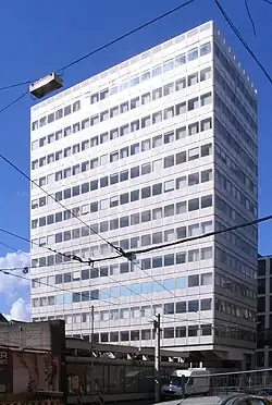 • Wie bereits angeführt lag auf dem Eckgrundstück östliche Kasernenstraße und dem aktuellen Graf-Adolf-Platz zu Beginn des 20. Jahrhunderts das Düsseldorfer Hauptpostamt. Zu Beginn der 1920er Jahre wurden nördlich von diesem Gebäude für die Hauptpost zwischen Breite Straße und Kasernenstraße weitere Gebäude für das Telegrafenamt (1922) und das Fernmeldeamt 1 (1951) errichtet.[66]