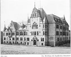 • Auf dem Grundstück Nr. 69b (später Nr. 69) wurde bis 1906 das Königliche Landratsamt Düsseldorf errichtet. Neben dem Landratsamt, Verwaltungssitz des Landkreises Düsseldorf, waren in diesem Gebäude diverse weitere Büros für kommunale Einrichtungen des Landkreises Düsseldorf untergebracht. Beispielsweise eröffnete ab 1906 in diesem Gebäude die Kreissparkasse Düsseldorf ihre Hauptniederlassung.[45]