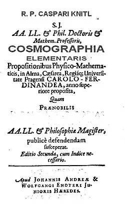 - Caspari Knitl. S.J. AA. LL. & Philos. Doctoris... Cosmographia Elementaris: Propositionibus Physico-Mathematicis in Alma ... Universitate Pragensi Carolo-Ferdinandea anno superiore proposita, Norimbergae, Andreas & Endter, 1674