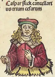 - ↑ Offiziell gab es keinen Vizekanzler, doch Schlick besaß entsprechende Befugnisse. Vgl.: Karl Schellhass: Das Vicekanzellariat Kaspar Schlick’s. In: Zeitschrift für Geschichtswissenschaft, Band 3, 1890