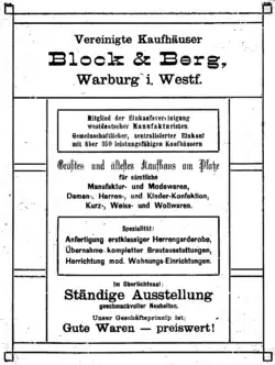 Ab 1933 kam durch den von den Nationalsozialisten organisierten Judenboykott auch Block & Berg in Schwierigkeiten. 1934 verkaufte Hugo Berg seine Villa für 17.500 RM an den „arischen“ Arzt Walter Czerwionka.[2][3] Block & Berg wurde 1936 an die Gebrüder F. und A. Schnorbus, Hallenberg, verkauft.[4] Hugos Mitgeschäftsführer Karl Block (* 1896) wanderte am 15. April 1937 zunächst nach Mailand und später nach Lima in Peru aus, wo er wieder ein Kaufhaus gründen konnte. Am 29. März 1939 emigrierte auch die Familie Hugo Berg und zog zunächst zur Verwandtschaft nach Amsterdam, wo sie in der Ruysdaelstraat 124 wohnte[5], und die Eltern im dortigen von Sally Berg gegründeten Modehaus Hirsch und im ebenfalls verwandtschaftlich verbundenen Maison de Bonneterie Arbeit fanden.