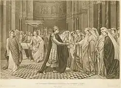 Kassia stammte aus einem vornehmen Elternhaus.[2] Ihr Vater war ein hoher Militär.[1] Bei der Brautschau des Kaisers Theophilos im Mai des Jahres 826 soll sie drei byzantinischen Chronisten zufolge dieser wegen einer geistreichen selbstbewussten Antwort hinsichtlich der theologischen Bedeutung der Erschaffung der Frau – trotz Favorisierung – nicht als Braut erwählt haben,[2][3] stattdessen nahm er die bescheiden und schüchtern auftretende Theodora.[1]