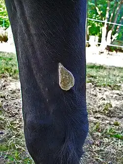 Als Kastanie werden Reste von Hornsubstanz auf den Innenseiten der Beine bei Pferden bezeichnet, bei denen es sich um rudimentäre Ballen – Handwurzel- bzw. Fußwurzelballen (Torus carpeus bzw. tarseus) – handelt.[1] Neben dem Hauspferd weist auch das Przewalski-Pferd Kastanien auf. Da sich die gemeinsame stammesgeschichtliche Entwicklungslinie von Hauspferd und Przewalski-Pferd vor etwa 120.000 bis 240.000 Jahren aufspaltete, muss dieses Merkmal auch bei ihren Vorfahren ausgeprägt gewesen sein.[2] Vereinzelt kommen auch beim Pferd Tiere mit nur zwei Kastanien vorn vor, gehäuft bei den Rassen Banker Horse[3] und Islandpferd[4].