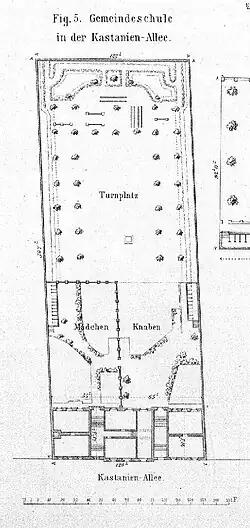 1857 genehmigte der Magistrat „die Errichtung einer neuen Communal-Schule vor dem Schönhauser Thore vorläufig mit 4 Klassen in einem hierzu in der Kastanien-Allee [Nr. 6] gemietheten Locale.“[35] Im darauffolgenden Jahr[36] wurde sie als erste Schule nördlich des Schönhauser Tores eröffnet und bekam 1864 in der späteren Kastanienallee 82 einen eigenen Schulbau,[37] einen dreigeschossigen Ziegel-Rohbau mit 14 Klassenzimmern nebst Lehrerwohnung.[38]