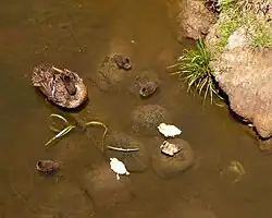 Einzelne Studien sind zu unterschiedlichen Schlupfraten gekommen. In einer in Victoria durchgeführten Studie schlüpften durchschnittlich aus 65 Prozent der Eier Küken. In einer anderen Studie dagegen schlüpften aus 78,5 Prozent der Eier Küken. Die Küken wiegen beim Schlupf durchschnittlich 27 Gramm.[15] An der Kükenführung beteiligt sich auch der Erpel. Die Mortalitätsrate ist hoch. Nach einer Studie starben von 1.289 Küken 60 Prozent vor dem Wechsel in das erste Alterskleid.