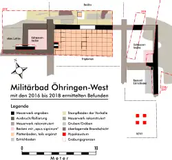 Als 2016 der Abbruch des inzwischen aufgegebenen Schlachthofs erfolgte, um an dessen Stelle eine Wohnanlage zu errichten, begleitete das Landesdenkmalamt die Aushubarbeiten. Dabei kam wohl jene römerzeitliche Mauer zu Tage, die wohl einst bereits die RLK freigelegt hatte. Letztendlich wurde auf Druck der anstehenden Bauarbeiten 2016/2017 eine Rettungsgrabung anberaumt, bei der tatsächlich die Ostseite des Kastellbades mit einem mehrphasigen Badebecken zu Tage kam. Aufgrund einer Lehrgrabung im Jahr 2018 konnte dann ein weiterer kleiner Ausschnitt des Kastellbades untersucht werden.[18]