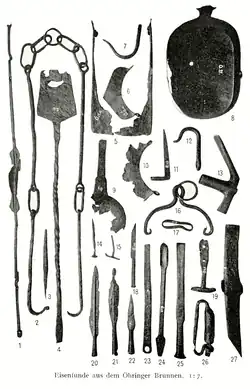 - ↑ Vergrabene Schätze: Versteckt, verwahrt, geopfert? In: Hans-Peter Kuhnen (Hrsg.):, Bernd Becker: Gestürmt, geräumt, vergessen? Der Limesfall und das Ende der Römerherrschaft in Südwestdeutschland. Begleitband zur Sonderausstellung vom 28.5.–1.11.1992. Württembergisches Landesmuseum Stuttgart, Theiss, Stuttgart 1992, ISBN 3-8062-1056-X, S. 92.