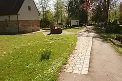 Traditionell wird das Brandgräberfeld von Aalen auf der Flur Krähenbühl am Aalener Burgberg verortet. Hier konnte 1925 ein rund 40 Quadratmeter umfassender Verbrennungsplatz des 2. und 3. Jahrhunderts dokumentiert und rund 90 Meter östlich davon das Fundament einer großen Grabanlage festgestellt werden.[37][38] Diese Feststellung wurde in der Vergangenheit unter anderem auch von Philipp Filtzinger und Dieter Planck in verschiedenen Veröffentlichungen vertreten. Es gibt jedoch Stimmen, die im Bereich der Brandspuren eine bisher unbekannte Villa Rustica vermuten. Martin Kemkes, wissenschaftlicher Leiter des Limesmuseums in Aalen, kam zudem zur Überlegung, in dem bisher als Grabmal interpretierten Befund vielleicht den Überrest eines öffentlichen Monuments zu sehen. Die 1925 ergrabenen Fundamente bestanden aus zwei quadratischen, rund 2 × 2 Meter großen steinernen plinthenartigen Sockeln, die in einem Abstand von rund 3,3 Metern symmetrisch zueinander angeordnet waren. Im Bereich zwischen den Sockeln stellten die Ausgräber eine sauber ausgeführte Pflasterung mit zumeist länglich-rechteckigen, bis zu über einem Meter langen Steinen fest. Dieses Pflaster setzte sich in einer Richtung noch rund 1,5 Meter fort.[39]