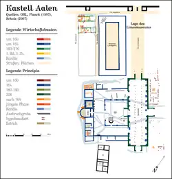 - ↑ a b Markus Scholz: Zwei Wirtschaftsbauten im Limeskastell Aalen. In: Andreas Thiel (Hrsg.): Forschungen zur Funktion des Limes. Band 2. Theiss, Stuttgart 2007, ISBN 978-3-8062-2117-6, S. 109.
