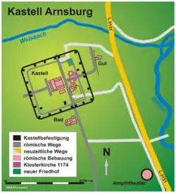 Die neuerliche Sichtung der Luftaufnahmen brachte auch den Nachweis eines Badegebäudes auf dem Gelände des umfangreichen, als Unterkunft für die Familienangehörigen der Soldaten errichteten Lagerdorfes (vicus) an der nach Süden führenden römischen Fernstraße unmittelbar vor dem Südtor des Kastells. Die erkennbaren Konturen ließen eindeutig auf die Umrisse eines römischen Kastellbades schließen. Ähnliche Strukturen innerhalb der Grundmauern eines östlich der Umwehrung gelegenen Gutshofes waren bereits vorher auf Fotografien lokalisiert worden, sodass es im Bereich des Kastells Arnsburg zwei Badeanstalten gegeben haben muss, aber nicht zwangsläufig zu gleicher Zeit. Ein Nachweis, dass es sich bei dem an der Straße liegenden Gebäude um ein Bad handelte, konnte durch den Fund eines 875 Gramm schweren Ziegelsteinbrockens, dessen Oberfläche durch beständigen Kontakt mit Wasser von Kalksinter überzogen war, erbracht werden.[3] Etwas weiter vom Südtor entfernt befand sich noch innerhalb des Lagerdorfs ein Amphitheater.