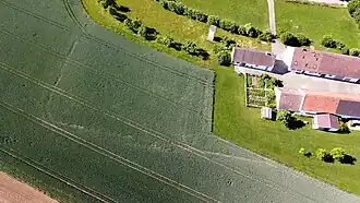 Durch Notbergungen konnte zudem westlich ein Brandgräberfeld aufgedeckt werden. Zwei weitere, hintereinander folgende Friedhöfe sind rund 300 Meter südlich bekannt. Bemerkenswert war in der Vergangenheit die Aufdeckung eines aufwändiger gestalteten Grabbaus der in die erste Hälfte des 3. Jahrhunderts datiert. Die 2,1 × 2,9 Meter umfassenden Totenmemoria besaß eine halbrunde Apsis.[53] Ein ähnlicher, im 2. Jahrhundert errichteter Bau wurde an der Gräberstraße des römischen Straßenknotenpunkts Sontheim an der Brenz aufgedeckt. Dort hatte sich im Zentrum der Anlage ein reiches Frauengrab erhalten.[54] Und auch aus Faimingen ist unter anderem solch ein Befund bekannt geworden.[55]