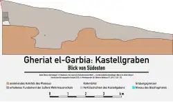 Da die severischen Prätorialfront als einziger Bereich des Kastells nicht durch das natürlich abfallende steile Plateau gesichert war, hatten die römischen Erbauer dort einen Abschnittsgraben angelegt,[63] der vor der Porta praetoria aussetzte. Die Ausgräber legten 2009 eine 1,35 Meter breite Berme frei, die der anstehende Kalkfels bildete. Anschließend konnte der Graben selbst beobachtet werden, der eine Breite von rund 2,40 Metern aufwies und in den Felsen geschlagen war.[64] Die horizontal gearbeitete, 1,40 Meter breite Grabensohle wurde[65] bei maximal einem Meter Tiefe erreicht.[64] An der Außenseite besaß der Graben eine Treppung und dahinter eine von einer Felsrippe gebildete Wange. Die Grabenverfüllung stammt frühestens aus dem späten 4. oder frühen 5. Jahrhundert, wahrscheinlicher jedoch sogar aus einer späteren, nicht genauer definierbaren Zeitstellung. Diesen Hinweis gibt das Randstück eines spätantiken Glaskruges oder einer Glaskanne, das 0,75 Meter über der Grabensohle geborgen wurde. Die darüberliegenden drei Bestattungen, ebenfalls 2009 entdeckt, wurden leider während der Ausgrabungen durch die archäologisch nicht geschulten Tuareg-Grabungshelfer gestört, da diese die ausgezeichnet erhaltenen Skelettreste unkontrolliert entnahmen und wiederbestatteten. So ist eine genaue stratigraphische Lage nicht mehr zu ermitteln. Die spätantiken Körperbestattungen gehörten zu einem ein- bis zweijährigen Mädchen und zwei Feten. Während die Feten offenbar beigabenlos gewesen sind, waren dem Mädchen ein einfacher Bronzearmreif und sieben, meist einfarbige opake Glasperlen mitgegeben worden. Die Stücke datieren in das fortgeschrittene 5. oder 6. Jahrhundert.[66] Durch die unglücklichen Fundumstände ist die genaue Lage der verschiedenen Kinder zueinander nicht bekannt.[67]