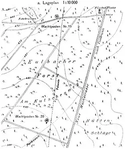 | Wp 10/20 | „Am Kutschenweg“ | ![]() ![]() Der Holzturmhügel, den die Limespalisade in 27 m östlicher Entfernung passierte, wurde 1896 von Eduard Anthes untersucht. Der Holzturm ruhte auf einem Fundament aus Trockenmauerwerk, das einen quadratischen Grundriss von 5,20 m Seitenlänge einnahm und zu Anthes Zeiten noch bis zu einer Höhe von 80 cm erhalten war. An den Ecken befanden sich 35 cm² große Aussparungen zur Aufnahme der Eckpfosten, die 1,30 m in die Tiefe versenkt waren. An allen Seiten wiesen die Mauern jeweils drei 10 cm bis 25 cm breite Schlitze auf. Das Innere des Trockenmauerwerkrechtecks war vermutlich mit Erde und Lehm verfüllt. Umgeben war der Turm von einem Ringgraben, dessen Durchmesser 15 m betrug. Das Profil des Grabens wurde nicht ermittelt. In etwa 20 m Entfernung südlich des Holzturms befand sich die Steinturmstelle, die bereits zur Zeit der Reichs-Limeskommission völlig zerstört war.[19] Die Turmstelle Wp 10/20 liegt in einem nicht öffentlich zugängigen Teil des Gräflich Erbach-Erbach'schen Wildparks. | ||||||