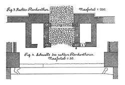- ↑ Anthes postulierte nur zwei Schlitze, nach Angaben von Conrady waren es aber vermutlich auf allen Seiten ursprünglich drei, von denen jeweils einer im Zuge von späteren Ausbesserungsarbeiten zugemauert worden war.