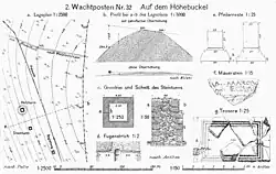 - ↑ Wp = Wachposten, Wachturm. Die Ziffer vor dem Schrägstrich bezeichnet den Limesabschnitt, die Ziffer hinter dem Schrägstrich in fortlaufender Nummerierung den jeweiligen Wachturm.