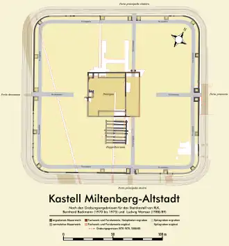 Bernhard Beckmann: Neuere Untersuchungen zum römischen Limeskastell Miltenberg-Altstadt. Lassleben, Kallmünz 2004, Beilage 1, Plan b. - ↑ Beckmann: Die Römer in Miltenberg. In: 750 Jahre Stadt Miltenberg, S. 41, und