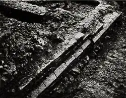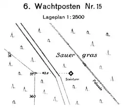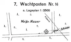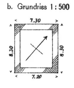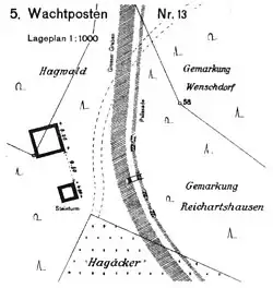 | Wp 7/16[67] | Weiße Mauer | ![]() ![]() Zur Feststellung etwa vorhandener Pfostengruben eines Holzturms wurden 1897 von Conrady erneut die vier Ecken des Baukörpers freigelegt, doch ließ sich nichts finden. Während dieser Ausgrabung wurde auch die Umgebung auf Turmspuren hin genauer untersucht, was jedoch ebenfalls erfolglos blieb. Im Inneren des Gebäudes konnten keinerlei Reste eines Estrichs wahrgenommen werden. Gefunden wurden hingegen Keramikscherben und zahlreiche glattköpfige Nägel. Das wohl isoliert am Limes errichtete Bauwerk, lediglich 209 Meter von der nächsten Turmstelle Wp 7/17 entfernt,[68] erinnerte an Nebengebäude wie sie an einigen Türmen dieser Strecke vorkommen.[69] Ein Turm befand sich hier offensichtlich nicht.[52] |