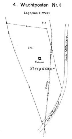| Wp 7/21 | Hollerstock | Conrady hat die Lage des Turms aufgrund einer Steinkonzentration in einem sonst steinfreien Acker gemutmaßt, die ihm der damalige Grundeigentümer bezeichnet hatte. Über die genaue Lage der von Conrady bezeichneten Stelle bestand später Unklarheit.[73] Heute ist hier nichts mehr sichtbar und unterliegt der landwirtschaftlichen Nutzung. |