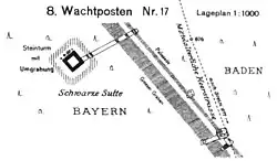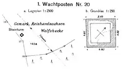 | Wp 7/17[70] | Schwarze Sutte | ![]() In seiner zweiten Untersuchung suchte Conrady vergeblich nach Pfostengruben an den vier Turmecken. Auch an diesem Platz bemühte er sich, einen eventuell älteren Holzturm fassen zu können. Fabricius konnte in Abständen von 1,80 bis 3,60 Meter vom Turm einen noch 0,65 Meter tiefen Umfassungsgraben belegen. Dieser war mit hereingefallenem Schutt vom Wachtturm, aber auch mit Keramikscherben angefüllt. Den noch 0,85 Meter tiefen Palisadengraben wies der Archäologe mittels eines Suchschnitts 18,45 Meter vor dem Turm nach. Er verlief parallel vor dessen Nordostmauer. Im bereits bekannten Abstand vor der Palisade fand sich auch der große Graben, der offensichtlich sehr flach ausfiel. Die Turmstelle liegt an einem Punkt, an dem sich das Gelände beginnt, sich in Richtung des Limes stark zu senken. Möglicherweise wurde aus diesem Grund Wp 7/17 an dieser Stelle errichtet.[68] |