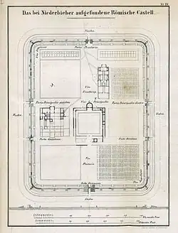 - ↑ Wilhelm Dorow: Römische Alterthümer in und um Neuwied am Rhein, mit Grundrissen, Aufrissen und Durchschnitten des daselbst ausgegrabenen Kastells, und Darstellungen der darin gefundenen Gegenstände. Schlesinger, Berlin 1826. (Digitalisat Textband 1826 Tafelband 1827 Digitalisat Tafelband 1827)