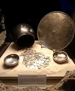 Die Kastellbesatzung erfüllte ihre Aufgaben über einen Zeitraum von guten sieben Jahrzehnten, bevor sie – nach älteren Theorien – während einer fränkischen Offensive oder einem Alamannenangriff ein gewaltsames Ende fand. Die jüngere Forschung tendiert demgegenüber zu der Annahme, Niederbieber sei im Zusammenhang mit den Ereignissen um die Gründung des Gallischen Sonderreiches (Imperium Galliarum) im Sommer oder Herbst 260 untergegangen.[41] Diese Theorie hat erstmals der amerikanische Historiker Lawrence Okamura ausgesprochen, nachdem er die Befunde studiert hatte.[14] Hilfreich bei der Datierung waren die Schatzfunde von Niederbieber.[42] Im Jahr 1900 waren auf dem Kastellgelände zunächst zwei Münzhorte, sechs Jahre später ein weiterer Münzschatz entdeckt worden. Die Schlussmünzen aller drei Horte stammen aus der gemeinsamen Regierungszeit des Kaisers Valerian und seines Mitregenten Gallienus (253–260). Sie stützen damit eine Deponierung und das Ende des Kastells während des endgültigen Zusammenbruchs des Obergermanisch-Raetischen Limes 259/260 oder kurz davor. Bereits Hoffmann hatte große Mengen an Tierknochen rings um das Stabsgebäude entdeckt.[14] Nach Okamura könnte dieser Befund darauf hindeuten, dass die Tiere angesichts einer drohenden Belagerung in das Kastell gebracht wurden, nachdem sich die Besatzung auf die Seite des in Köln amtierenden Unterkaisers Saloninus geschlagen hatte. Saloninus war ein Sohn des regierenden Gallienus und musste sich 260 gegen den letztendlich erfolgreichen Usurpator Postumus verteidigen. Der im Stab des Saloninus tätige Kommandeur Postumus wandte sich gegen den Regenten, ließ ihn hinrichten und gründete das bis 274 bestehende Gallische Sonderreich. Zuvor könnten die Truppen des Postumus jene Heeresverbände angegriffen haben, die offen gegen den Usurpator standen. Spuren am südlichen Turm des Westtores, die auf ein Untergraben der Mauer hindeuten, können laut Okamura nicht von Germanen stammen. Er sieht hier Zeichen einer römischen Belagerung, bei der Pioniere eine professionelle Untertunnelungstechnik angewandt hätten. Nachdem die Soldaten des Postumus in das Kastell eingedrungen waren, hätten sie die Verteidiger niedergemacht.