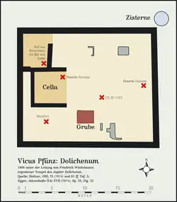 Ein Bauwerk, das rund 50 Meter vor dem Südtor lag, war Jupiter Dolichenus, einem kleinasiatischen Soldatengott, geweiht. Das Dolichenum wurde 1888 ergraben. Der fast rechteckige Tempel besaß eine Länge von 21,10 und 21,45 Metern und eine Breite von 18 und 18,20 Metern. Die 0,90 Meter starken Umfassungsmauern des Heiligen Bezirks waren noch auf einer Höhe zwischen 0,20 und 0,50 Metern erhalten. Die fast in der Achse des Kultbezirks, 1,20 Meter von der westlichen Umfassungsmauer entfernt liegende 4,80 × 4,80 Meter große Cella war nach Osten hin offen. Ein nördlich zwischen der Cella und der nördlichen Längsmauer angebauter Raum wurde von den Ausgräbern als Sakristei angesprochen. Die seitlich vor der Cella liegende 1,70 Meter tiefe rechteckige Grube könnte als Keller oder Zisterne gedient haben.[43] Die aufgefundenen gemauerte Basen im Heiligen Bezirk trugen einst Votivsteine. Während der Grabung wurden im Dolichenum zwei Votivtäfelchen aus Bronzeblech mit der Inschrift Iovi Optimo Maximo Dolicheno entdeckt.[44] Eines trug den Namen des weihenden Priesters Demittius (= Domitius).[45] Auf einem dritten Bronzeplättchen-Bruchstück ist die Inschrift nur noch unleserlich erhalten geblieben.[46]