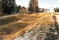 | Erhaltungszustand | Wehrmauer teilweise freigelegt und teilkonserviert, Gräben und Straßentrasse nach Süden deutlich sichtbar. |