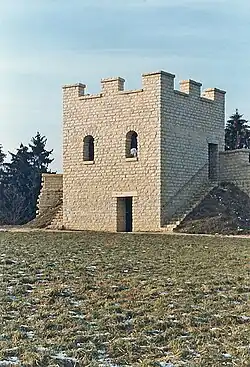 Ohne fachbezogene wissenschaftliche Mithilfe und ohne moderne archäologische Voruntersuchung[8] wurden zwischen 1992 und 1994 auf den antiken Mauerstümpfen in großflächiger, jedoch „wenig geglückter Art“[3] das Nordtor, der Nordwestturm und die dazwischenliegende Umwehrung nachempfunden.[9] Wie bei vielen fachlich nicht unterstützten Initiativen am Limes, einen nicht bekannten antiken Bestand zu ergänzen, wurden dabei teilweise verschiedene Befunde von anderen Kastellen, die in Pfünz nicht gemacht wurden, zusammengefasst. Da man beim Wiederaufbau gleichzeitig jedoch tatsächliche Befunde aus Pfünz nicht berücksichtigte, fehlt dem Nachbau nun das auch bei anderen Kastellen übliche Gesims an Tor und Mauer. Tor und Turm wurden zudem ein Stockwerk zu niedrig wiederaufgebaut und der Eckturm wird in der Antike mit einem Dach ausgestattet gewesen sein, obwohl man bei der RLK-Grabung dazu keinen Anhalt fand.[3] Somit gibt dieser Nachbau nur eine sehr frei interpretierte allgemeine Vorstellung von einem „römischen Kastell“. Ein wesentliches Erscheinungsmerkmal antiker Militärbauten ist ebenfalls nicht dargestellt. So trugen die Anlagen einen weißen Verputz, bei dem mit rotem Fugenstrich ein Quadermauerwerk vorgetäuscht wurde.