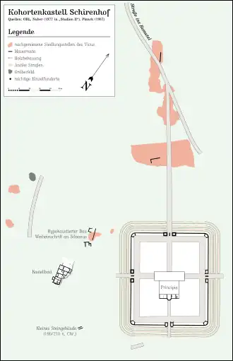 Von der Innenbebauung ist nur der rückwärtige Teil der Principia näher bekannt, da es zur Strategie der Reichs-Limeskommission zählte, dieses Bausegment vorrangig zu ergraben. Hier erhofften sich die Ausgräber interessante Funde, da das Fahnenheiligtum nicht nur die Standarte der Einheit, sondern im Keller darunter die Truppenkasse barg. Das Auffinden alter Münzen in bestimmten historischen Bodenschichten kann mit Hilfe der Numismatik viele wertvolle Rückschlüsse auf einen ergrabenen Baukomplex zulassen. Auf dem Schirenhof ist möglicherweise Verwaltungspersonal der Principia durch die – allerdings umstrittene – Nennung eines Liberarius Cohortis I Raetorum bekannt geworden.[19] Die stark beschädigte Inschrift[20] auf einer roten Sandsteinplatte kann frühestens auf die Zeit ab der Mitte des 2. Jahrhunderts datiert werden.[21] Eine zweite Ergänzungsmöglichkeit zu [F]idelis lim[itanea(?) 3 coh(ortis?)] / Raet[orum] bietet CIL 3, 11924 an.